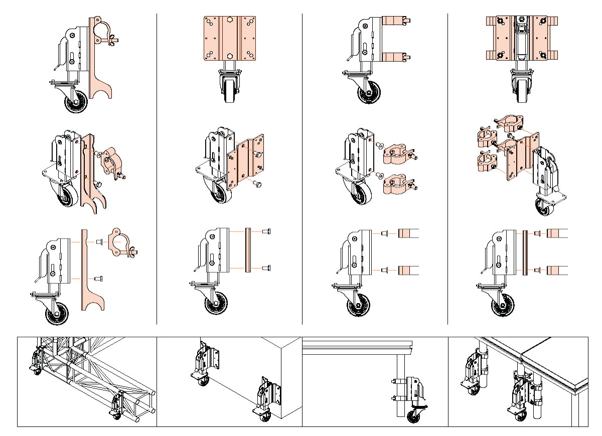 Our multi-purpose Lifting wheels quickly move truss, stage decks, boxes or other types of decor pieces out of the way without hassle. Directly mount the wheels on stage legs or expand your options