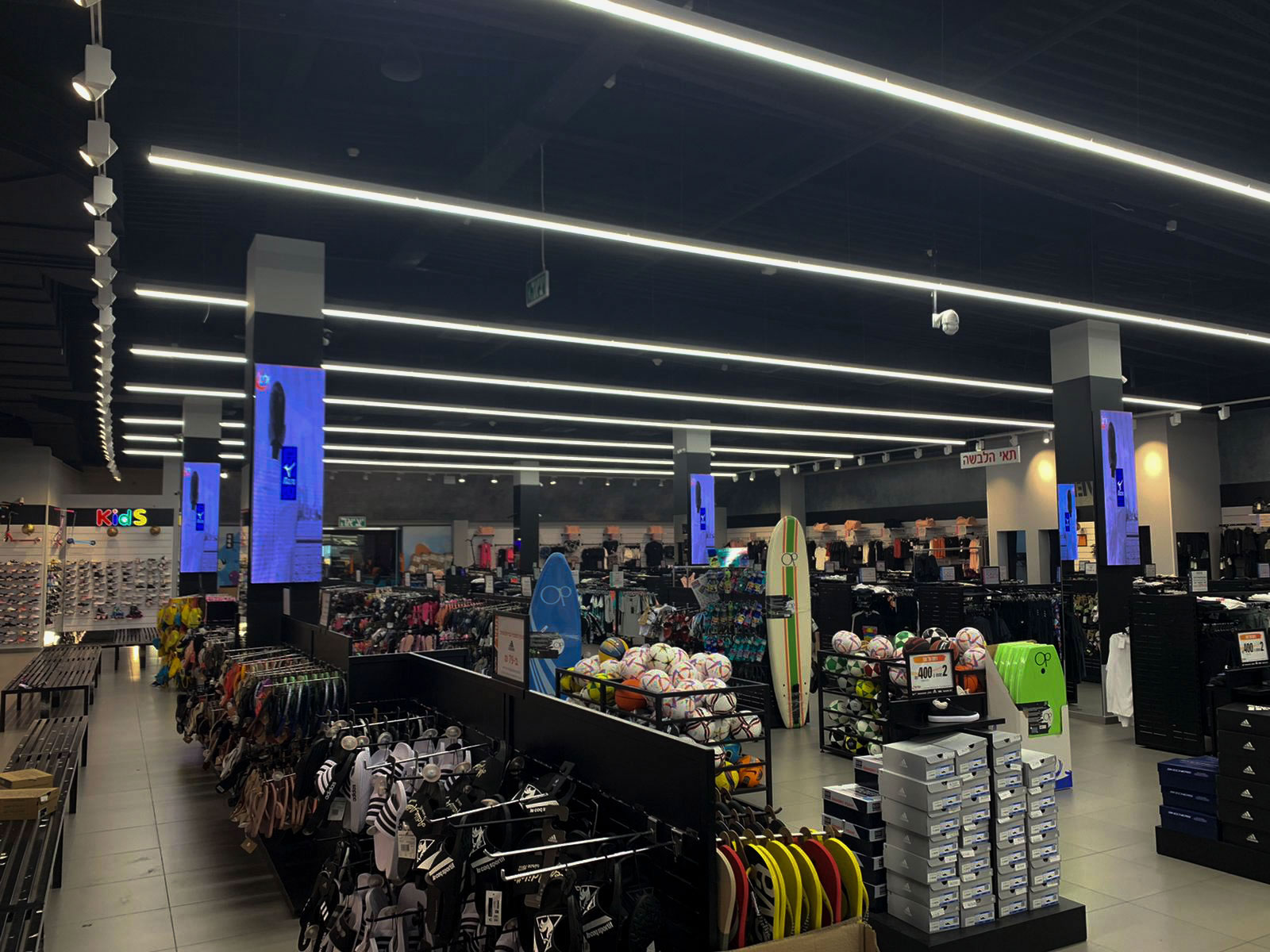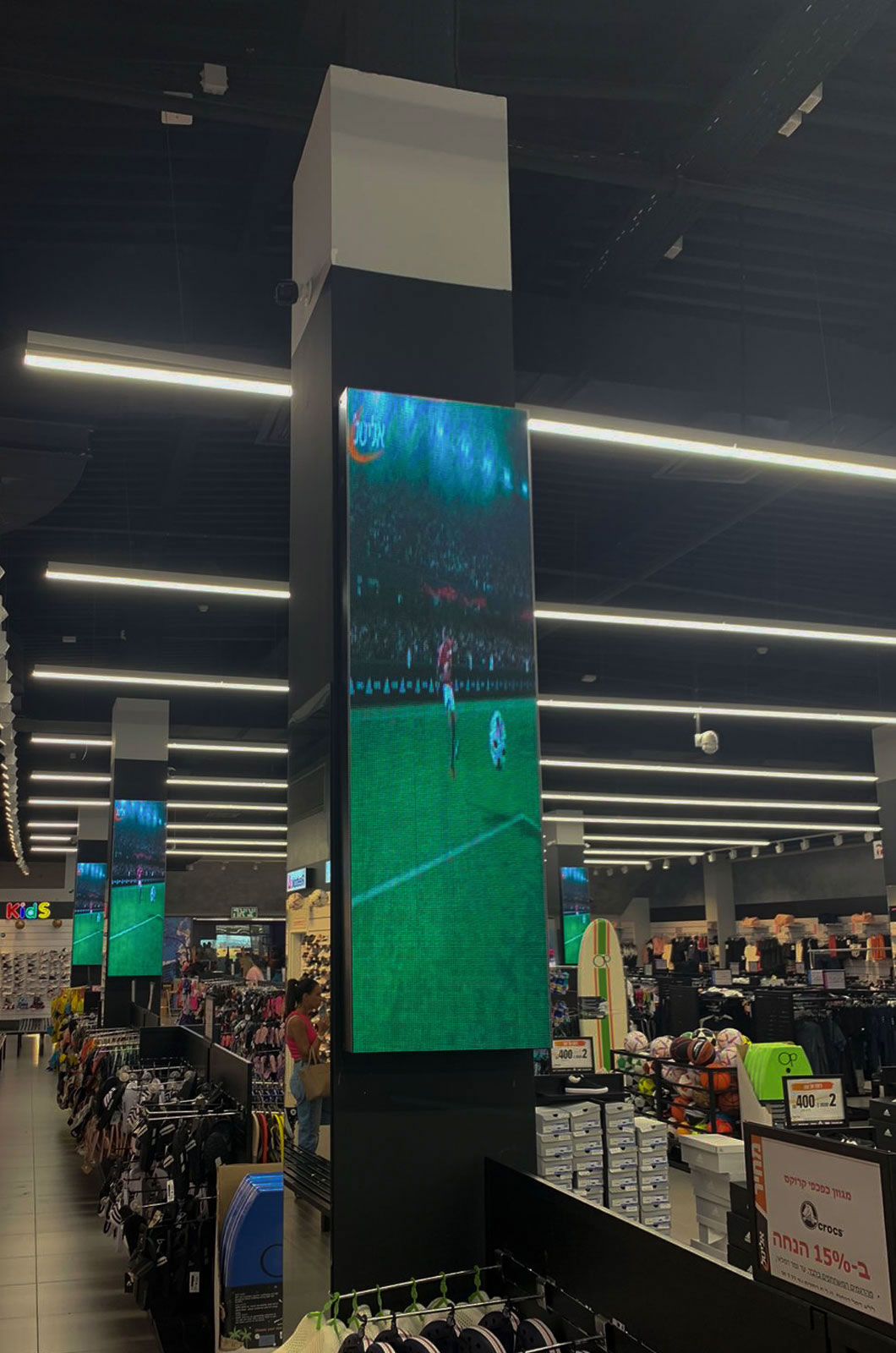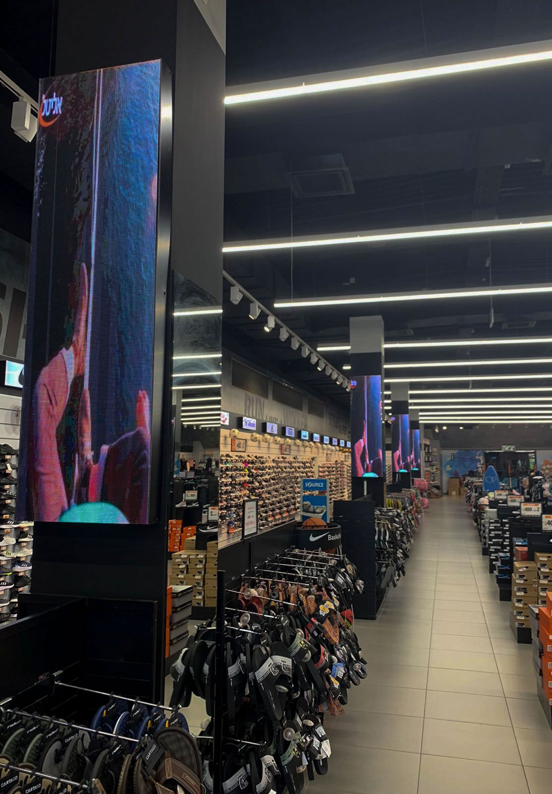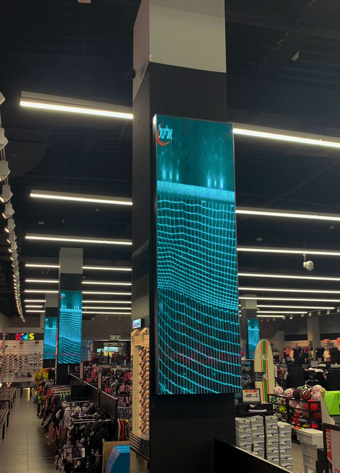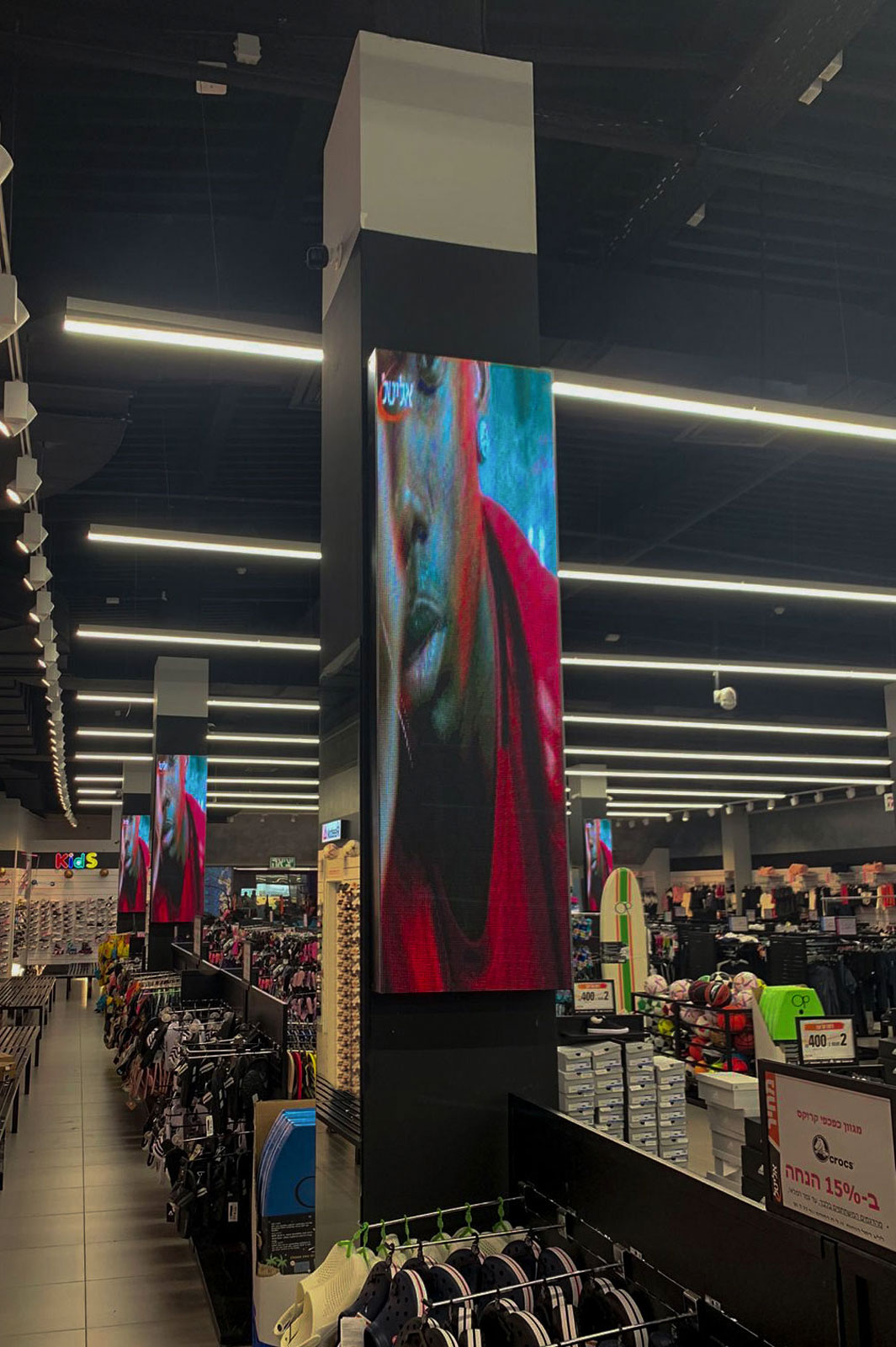 בקניון עד הלום אשדוד - שולבו מסכי P3 לאורך החנות ומסך ראשי באזור הקופות.