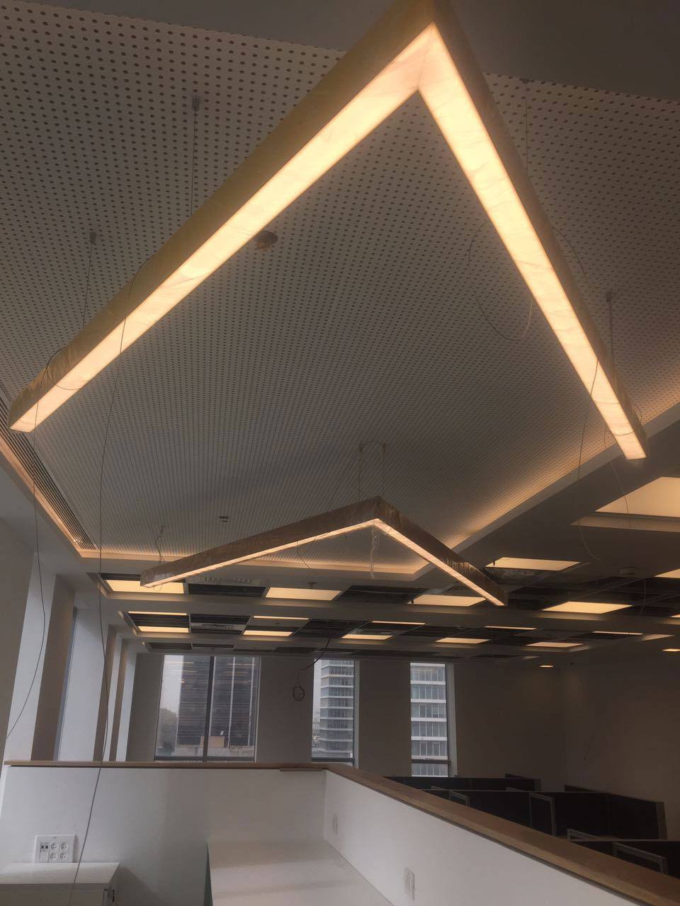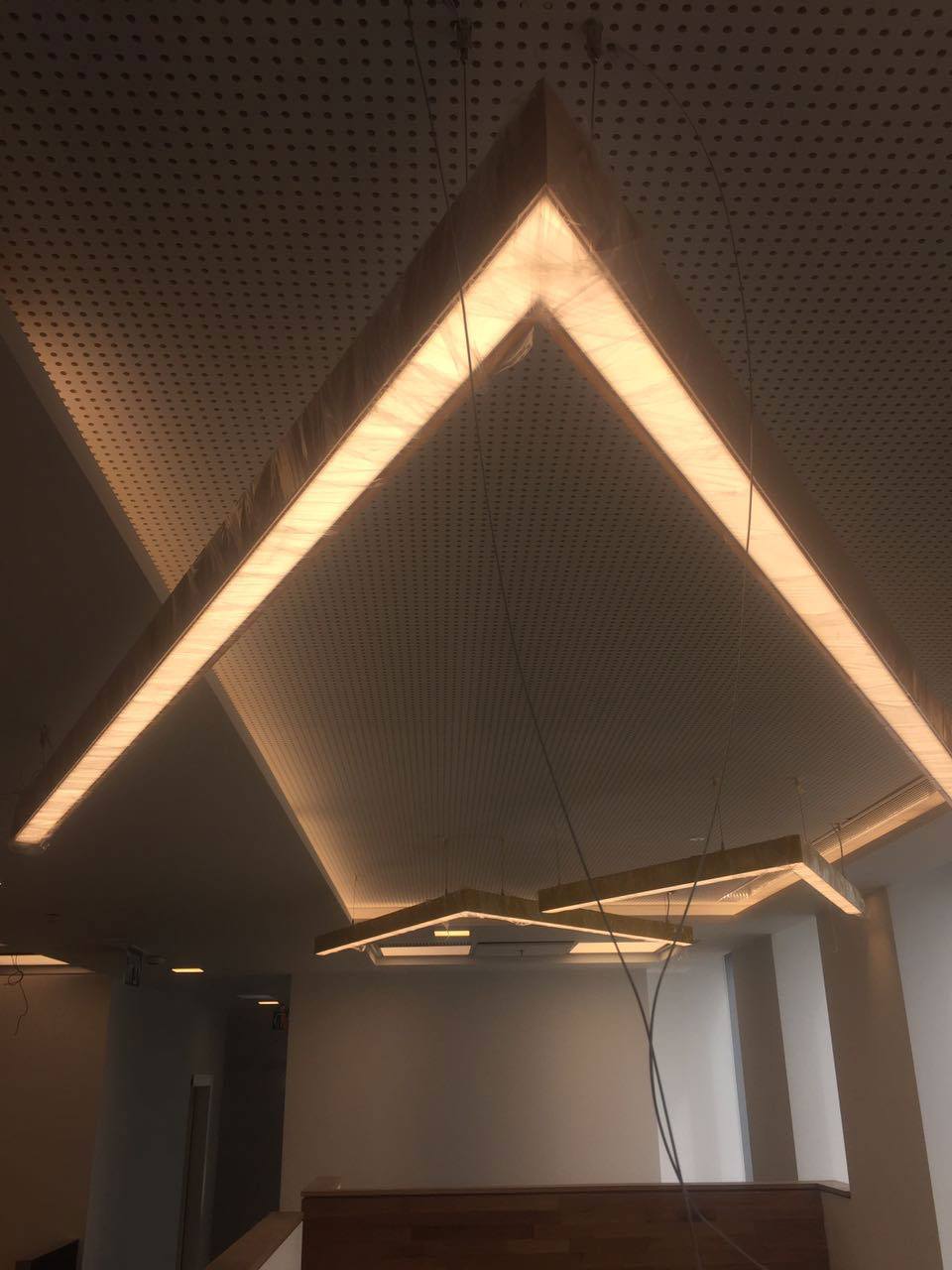 במקום הותקנו גופי תאורה הבנויים מפרופילים שיוצרו במיוחד בצורת חץ, בגוון לבן חם וקר, כדי שיתאימו לעיצוב המקום. את הפרופילים חיפינו בעץ אלון לפי דרישה.
