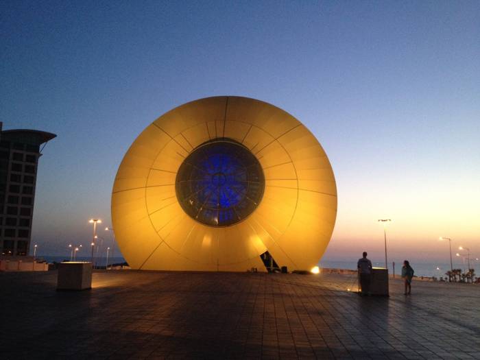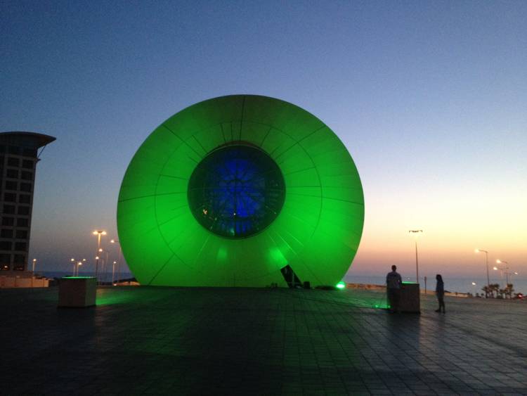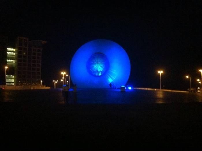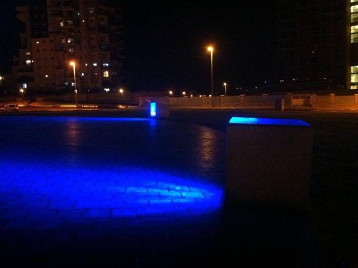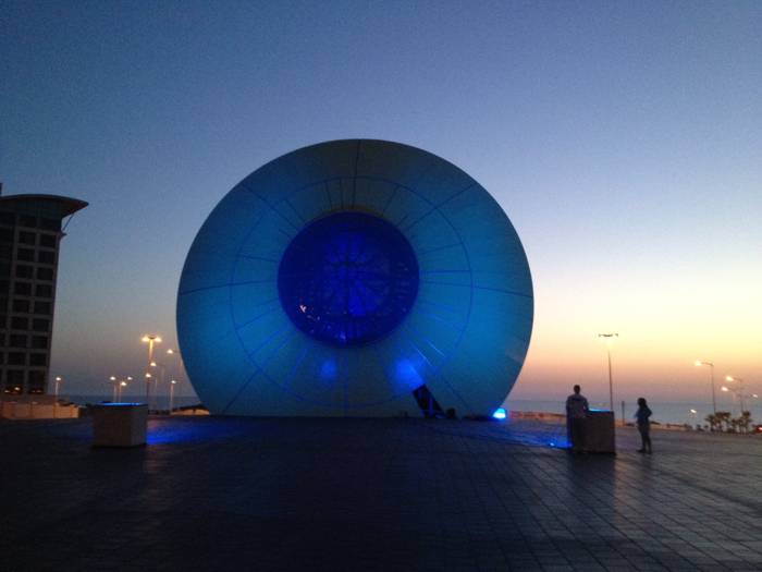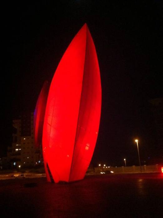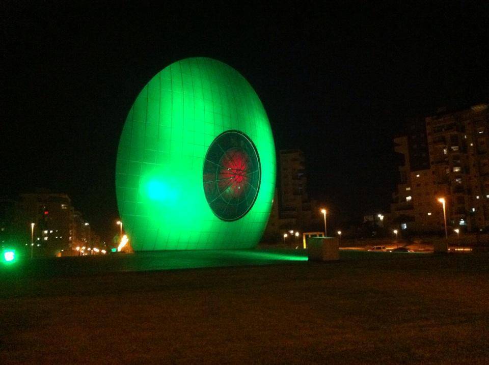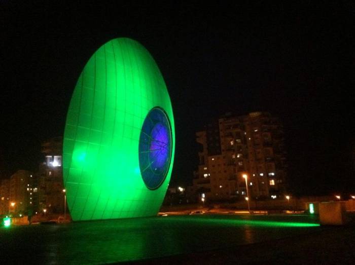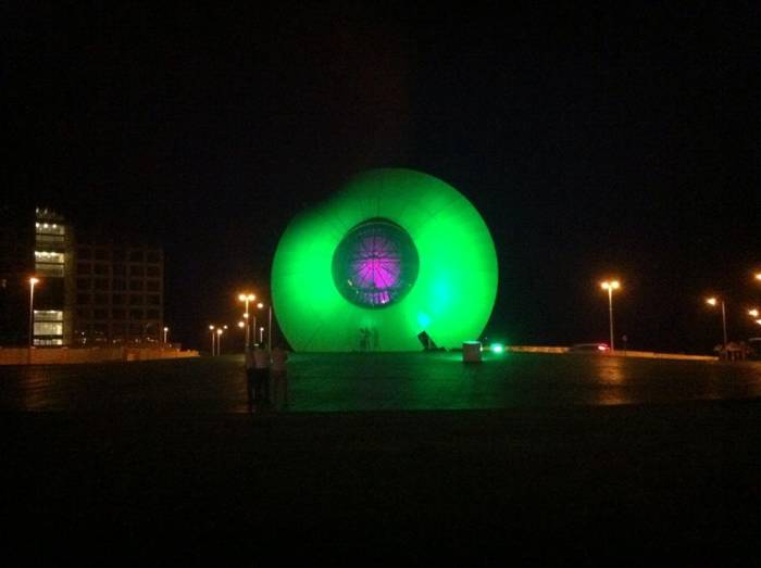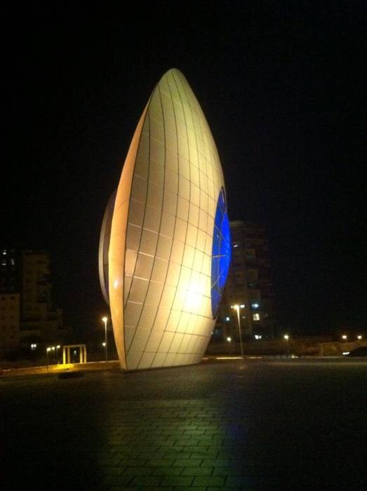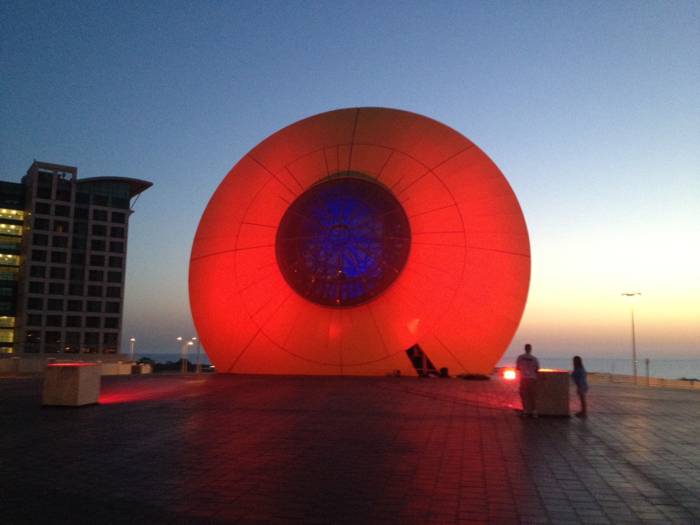 הפסל "עין השמש" שעוצב על ידי האומן מוטי מזרחי מואר ב-4 פנסי DUAL 800 תאורה אדריכלית המובילה בעולם מבית STUDIO DUE.