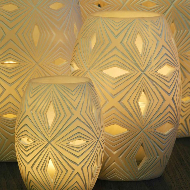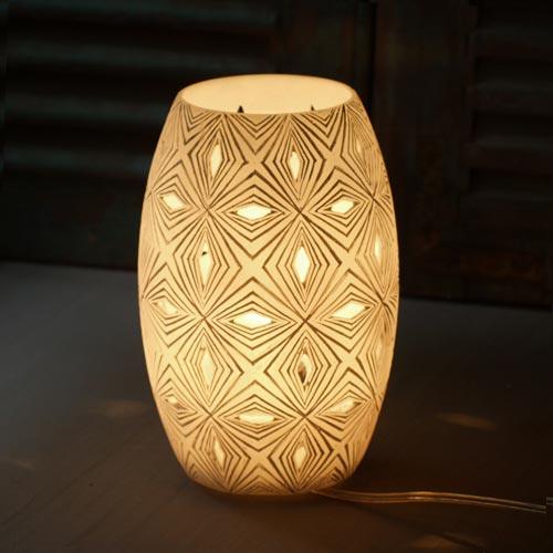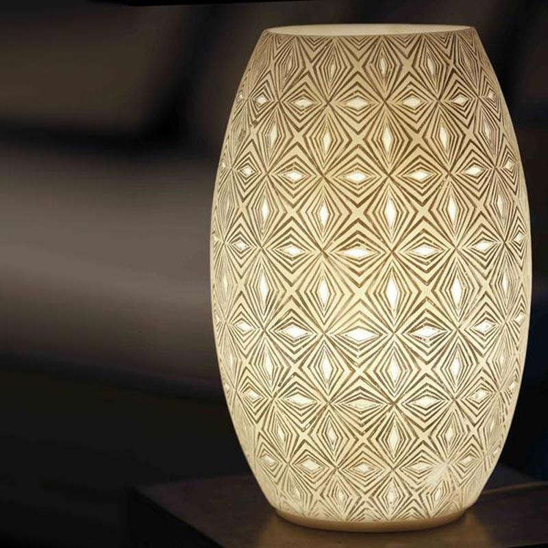 מנורת שולחן מעוצבת בסגנון מיוחד, המנורות עשויות בעבודת יד ובעדינות מאבן חול ובדוגמאות ייחודיות. קרני האור המופקות מהנורה שמשלבים עוברים דרך המעטפת העדינה של אבן החול. בית נורה E27.